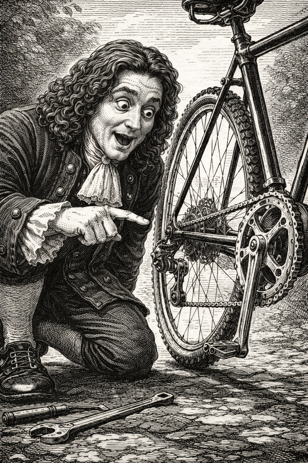 Denis Papin (1647-1713) s'émerveillant devant une chaîne de vélo