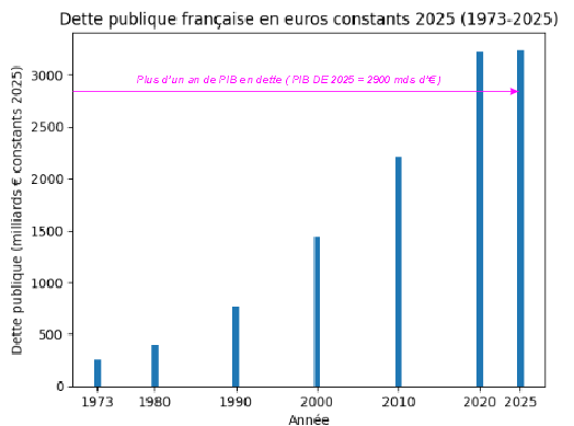Evolution de la dette publique, en € corrigés de l'inflation entre 1973 et 2025