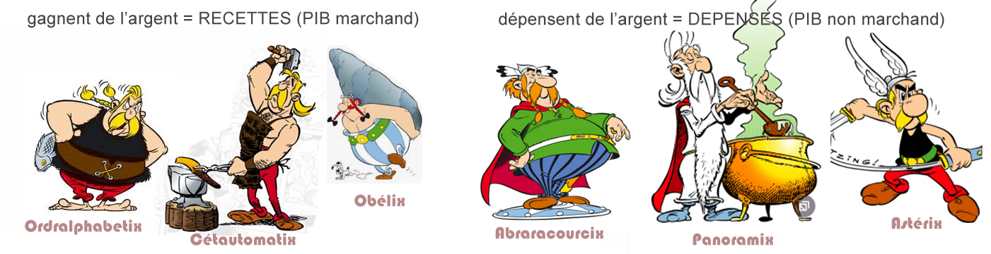 Il n'est pas le seul fonctionnaire du village gaulois...il y en d'autres ! Panoramix le druide, inventeur de la potion magique, ne fait aucun bénéfice en la vendant (secret militaire). Abraracourcix, le chef, est un fonctionnaire politique, il ne vend pas ses décisions (3). Ces 3 personnages, Astérix, Abraracourcix, et Panoramix, constituent le "SECTEUR PUBLIC" du village gaulois, et ce village est une organisation sociale dans laquelle le poissonnier, le forgeron, et le livreur de menhirs (PIB MARCHAND = RECETTES) ont compris DES L'ORIGINE, la nécessité de financer l'activité d'Astérix, de Panoramix, et d'Abraracourcix (PIB NON MARCHAND = DEPENSES).
